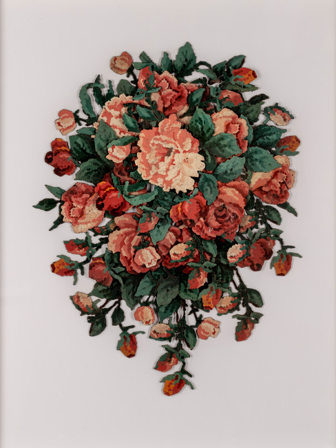 Roser, Hand cut and collaged flooring salvage, wood, paint, glue, 26 1/2” x 20”, 2019; Push, Hand cut and collaged flooring salvage, wood, paint, glue, 10 3/8” x 13 5/8”, 2019; both images courtesy of the artist.