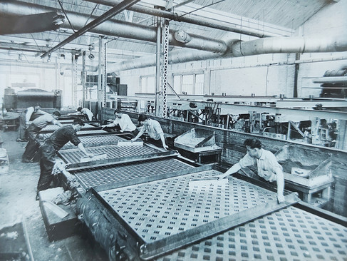 The Kirkcaldy Museum in Kirkcaldy Scotland houses over 6000 samples of linoleum and related artifacts to the trade. It was established in 1925 by John Nairn, grandson of the Kirkcaldy-based linoleum manufacturer Michael Nairn, and houses a large painting collection of Scottish artists and a permanent exhibition covering the town's industrial heritage. The archive is housed in a former Amazon Warehouse (given the trajectory of linoleum, which was created during the industrial revolution, I found this to be deeply ironic). Because of what I had learned at Hagley, I was able to be more specific about the samples I requested to see in Kirkcaldy. For two days I reviewed hundreds of samples, books, images, tools, and ephemera. I was at the epicenter of the topic and was able to view things that no other museum would have: the factory printing tools, large samples of mosaic and inlaid linoleum, original images of factories processing the material, and more. I began to understand the real scale of linoleum production and how complicated it was. At its peak Kirkcaldy had six competing companies producing linoleum within blocks of one another. Knowing this had me re-evaluating those broken pieces of flooring found in the junkyard in northeast Philadelphia.
